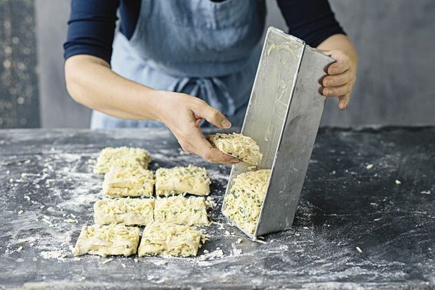 Die Teigpäckchen übereinander in die Form schichten. Die Form wieder auf ihren Boden stellen und die Teigstücke etwas auseinanderziehen.