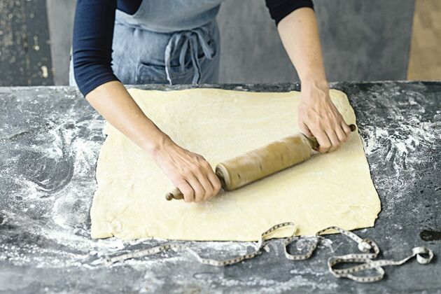 Den gegangenen Hefeteig noch einmal kurz durchkneten und auf einer leicht bemehlten Arbeitsfläche zu einem Quadrat (48 × 48 cm) ausrollen.