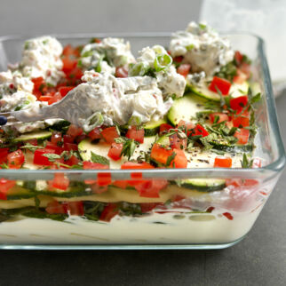 Zucchini und Tomaten waschen. Kartoffeln, Zwiebeln und Knoblauch schälen. Alles in sehr dünne Scheiben schneiden. Eine große Auflaufform (20 x 25 cm) mit Öl ausstreichen, das Gemüse hineinschichten. Mit Meersalz und Pfeffer würzen.