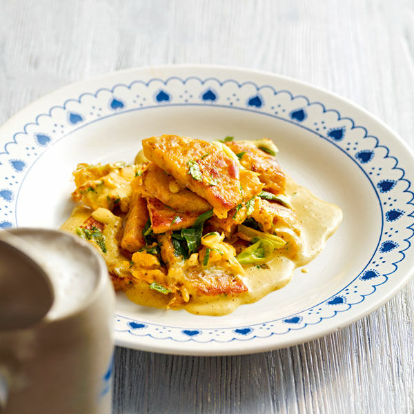Bayern ohne Knödel? Geht nicht! Daher kommen übrig gebliebene Knödel vom Vortag mit Brühe, Eiern und Gemüse in die Pfanne. Deftiges zum Sattessen.