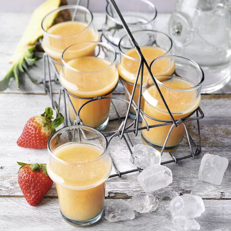 Die Ananas, Aprikosen und Erdbeeren mit Limettensaft, Zucker, Eiswürfeln und Mineralwasser in den Mixer geben und alles auf höchster Stufe fein pürieren.