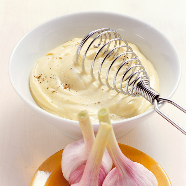 Das Öl nach und nach mit dem Schneebesen unter die Eigelbcreme rühren, bis eine Mayonnaise entsteht. Übrigen Knoblauch schälen und durch die Presse dazudrücken. Aïoli mit Salz abschmecken.