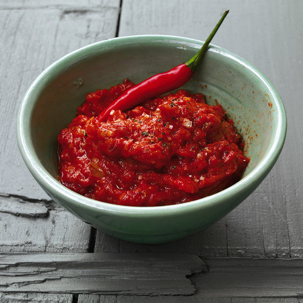 Backofen auf höchste Stufe vorheizen. Paprika waschen, längs halbieren, putzen. Backblech mit Alufolie auslegen, Schotenhälften mit der Haut nach oben darauf legen, flach drücken. Im Ofen (oben) 15-20 Min. backen, bis die Haut dunkle Blasen wirft. Abkühlen lassen, häuten, pürieren.
