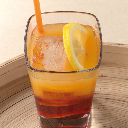 Zunächst den Kirschsirup, dann Traubensaft, danach Orangensaft und schließlich Zitronensaft darüber gießen. Auf diese Weise ergeben sich vier ineinander übergehende Farbschichten. Den Drink mit Trinkhalm servieren. Vor dem Trinken einmal durchrühren.