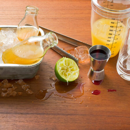 In jedes Glas 4 Eiswürfel geben. Den Orangensaft, den Ananassaft, den Aprikosennektar, den Maracujanektar und den Limettensaft mit 8 Eiswürfeln in den Shaker geben. Den Shaker verschließen und etwa 30 Sek. kräftig schütteln.
