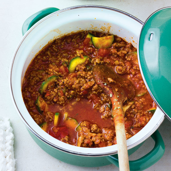 Die Frühlingszwiebeln und Zucchinoscheiben zum Hackfleisch geben, die Brühe angießen und die Sauce bei mittlerer Hitze zugedeckt ca. 10 Min. köcheln lassen. Die Tomaten zugeben und gut unterrühren. Die Sauce weitere 10 Min. köcheln lassen, bis das Gemüse weich ist, dann mit dem Tomatenmark etwas andicken.