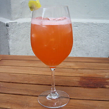 Die fertigen Eiswürfel in zwei große Gläser geben. Jeweils 4cl Aperol in jedes Glas füllen. Dann das Pfirsichlikör und den Grapefruitsaft dazugeben.