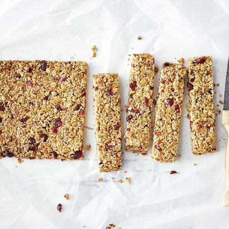 Backofen auf 160° vorheizen. Eine Auflaufform (ca. 18 × 32 cm) mit Backpapier auslegen. Flockenmischung in der Form ca. 1 ½ cm hoch verstreichen. Im Ofen (Mitte) in ca. 25 Min. goldbraun backen. In der Form 15-30 Min. abkühlen lassen, dann in 16 Riegel schneiden. Auf einem Kuchengitter in ca. 1 Std. vollständig abkühlen lassen.