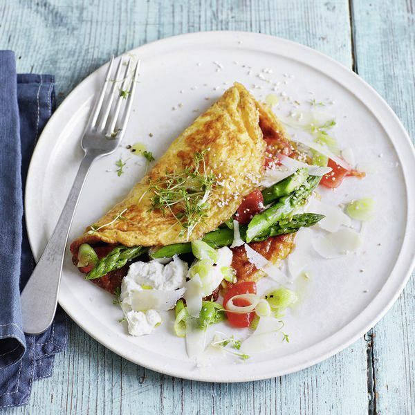 Die Omeletts auf vier vorgewärmten Tellern anrichten, die Spargel-Tomaten-Mischung in die Mitte geben. Ricotta in Flöckchen darauf verteilen, alles mit dem Parmesan bestreuen. Die Kresse vom Beet schneiden, zwei Drittel davon auf das Gemüse streuen. Die Omeletts zusammenklappen und mit der restlichen Kresse bestreut servieren.