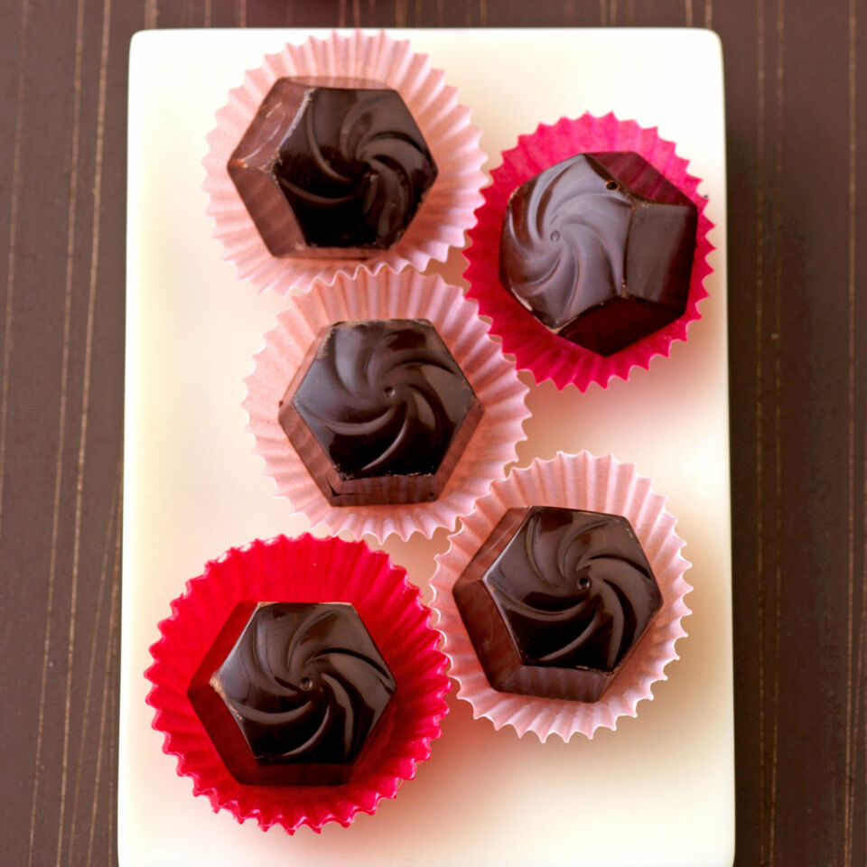 Tipp: Selbstgemachte Pralinen kannst du mit essbarem Gold oder Mustern von sogenannten Transferfolien verzieren. Hübsche 3D Effekte, wie Wellen oder Herzchen bekommen sie durch Strukturfolien.