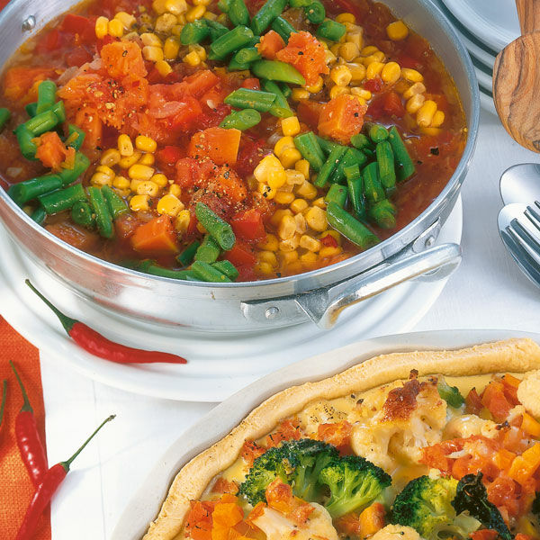 Den Kürbis schälen, die Kerne herauskratzen, das Kürbisfleisch würfeln. Die Tomaten überbrühen, häuten und würfeln, dabei die Stielansätze entfernen. Die Chilis längs aufschneiden, entkernen und sehr fein würfeln. Die Bohnen waschen, die Enden entfernen, Bohnen in kleine Stücke schneiden. Den Mais abtropfen lassen. Die Zwiebel und den Knoblauch schälen und klein würfeln. Die Paprikaschote halbieren, putzen, waschen und würfeln.