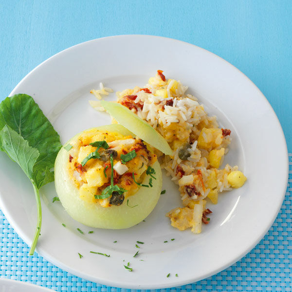 Backofen auf 200° vorheizen. Die Kohlrabi bis auf einen schmalen Rand aushöhlen. Das Fruchtfleisch klein schneiden. Öl erhitzen und die Zwiebel darin 2 Min. dünsten. Kohlrabi- und Ananasfruchtfleisch 4 Min. mitgaren. Unter den Grieß heben, mit Salz, Pfeffer und Kapern pikant würzen. Die Kohlrabi mit einem Teil der Masse füllen und in eine Auflaufform setzen. Im Ofen (Mitte, 180°) ca. 30 Min. garen.