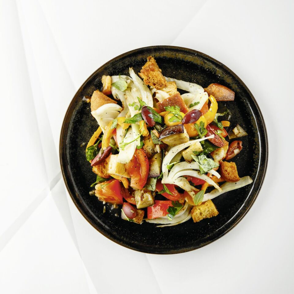 Zuletzt Brot und Fenchel sorgfältig untermischen, Basilikum und Petersilie unterheben. Die Panzanella vor dem Servieren 10-15 Min. durchziehen lassen. Bei Bedarf nochmals mit Salz, Pfeffer und Essig abschmecken.