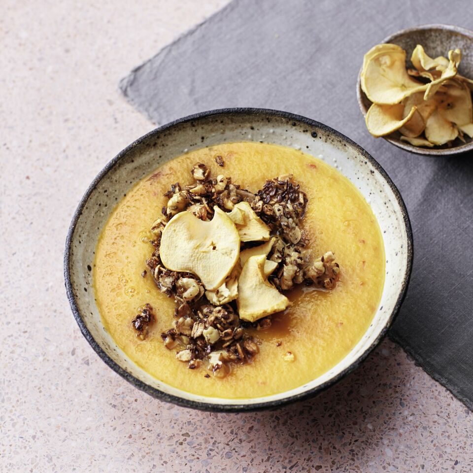 Die Apfelchips nach Belieben grob zerbröseln oder ganz lassen. Den Smoothie auf Bowls verteilen. Die Nussstreusel und die Apfelchips darauf anrichten. Sofort servieren.