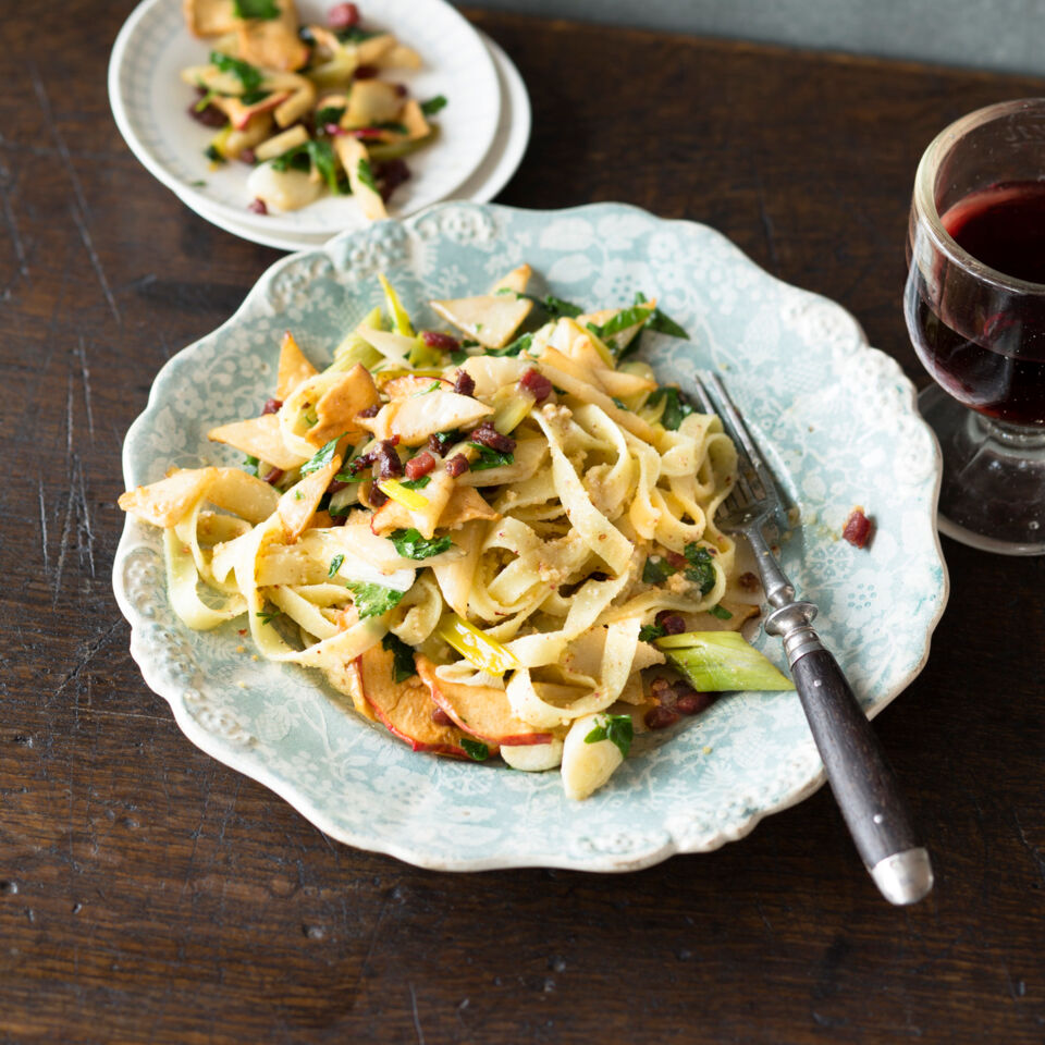 Zum Servieren das Apfel-Nuss-Pesto mit frisch gekochten Nudeln (z. B. Tagliatelle) mischen, dabei evtl. etwas Kochwasser untermischen. Die Pestonudeln mit Salz und Pfeffer abschmecken, auf Teller verteilen und die Selleriemischung darauf anrichten.