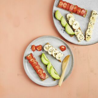 Tipp: Nicht nur Äpfel und Bananen können so belegt werden, auch andere Früchte eignen sich prima - z. B. in Scheiben geschnittene Melone, Pfirsich und Nektarine sowie Birne und Kiwi. Zum Bestreichen bieten sich verschiedene Nussmuse an und zum Bestreuen Hanfsamen, gemahlene Nüsse, Sesam, Trockenfrüchte, Kakaopulver und Ceylon-Zimtpulver.