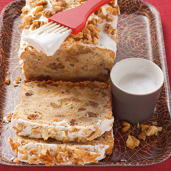 Für die Glasur den Puderzucker mit 1– 2 EL Zitronensaft glatt rühren und das Apfelbrot damit bestreichen. Mit den übrigen gehackten Nüssen bestreuen. Dann die Glasur fest werden lassen.