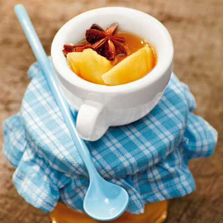 Backofen auf 160° (nur Ober- und Unterhitze verwenden) vorheizen. Die Äpfel schälen, vierteln und entkernen, jedes Apfelviertel in 2-3 Spalten schneiden. Apfelspalten eng in die ofenfeste Form schichten und mit dem Gewürzsirup begießen. Die Form mit Alufolie zudecken und in den Ofen (Mitte) schieben, die Äpfel 30 Min. garen.