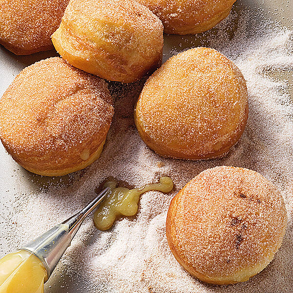 Für die Füllung das Apfelmus in einen Spritzbeutel mit langer Spritztülle füllen und portionsweise in die Krapfen spritzen (s. Grundrezept S. 58). Zucker und Zimt vermischen, die Krapfen in der Zucker-Zimt-Mischung wenden und erkalten lassen.