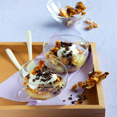 Apfelmus hat sich hier mal feingemacht: geschichtet mit goldbraunem Mandelkrokant, sahnigem Vanillequark und viel geriebener Schokolade obendrauf.
