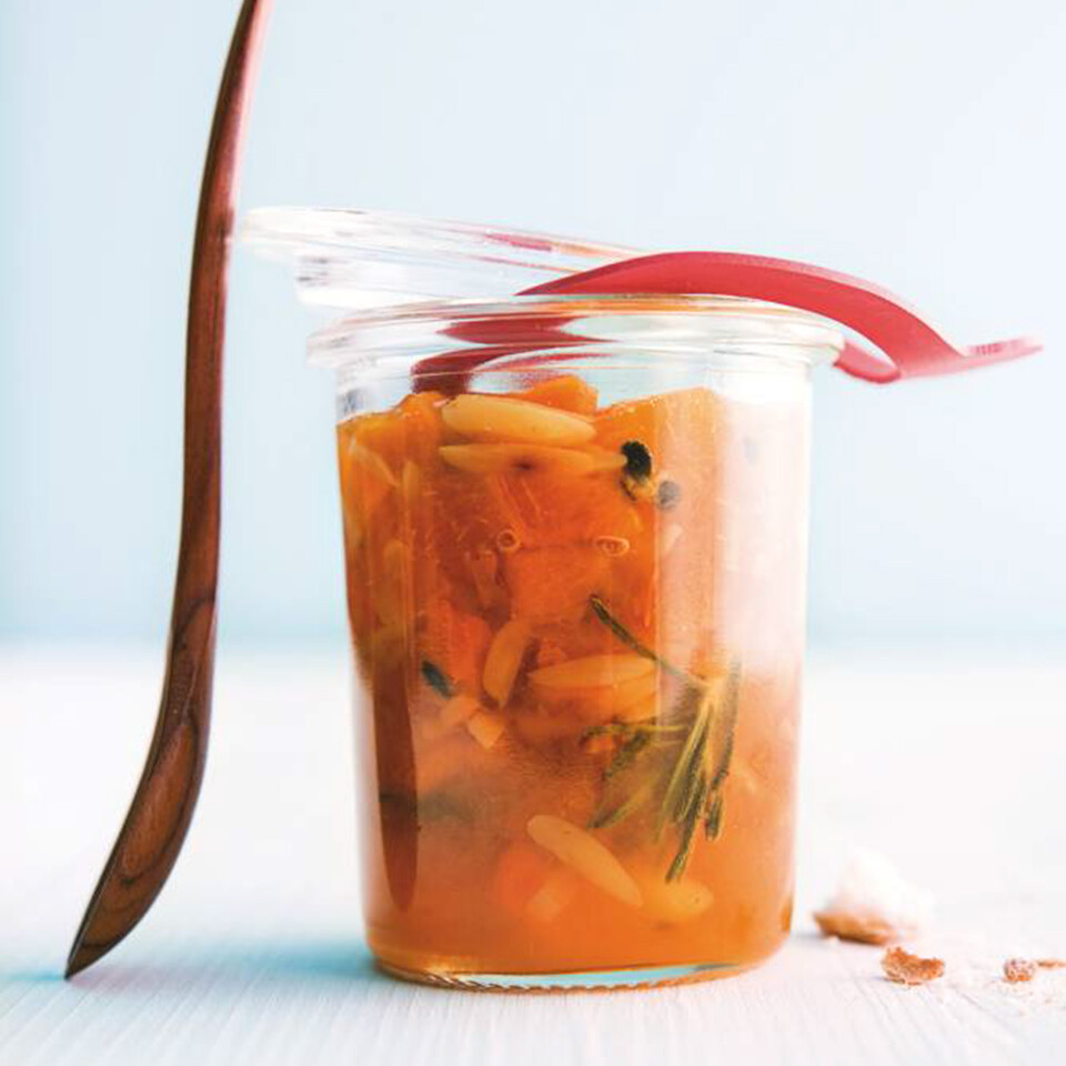 Die Aprikosen waschen, halbieren, entsteinen und die Hälften klein würfeln. Die Mandeln in einer kleinen Pfanne ohne Fett rösten. Die Passionsfrüchte halbieren, das Fruchtmark mit einem Teelöffel herauslösen. Mit Aprikosen, Rosmarin, Mandeln und Gelierzucker in einen Topf geben und ca. 5 Min. sprudelnd kochen lassen. Dabei gelegentlich umrühren.