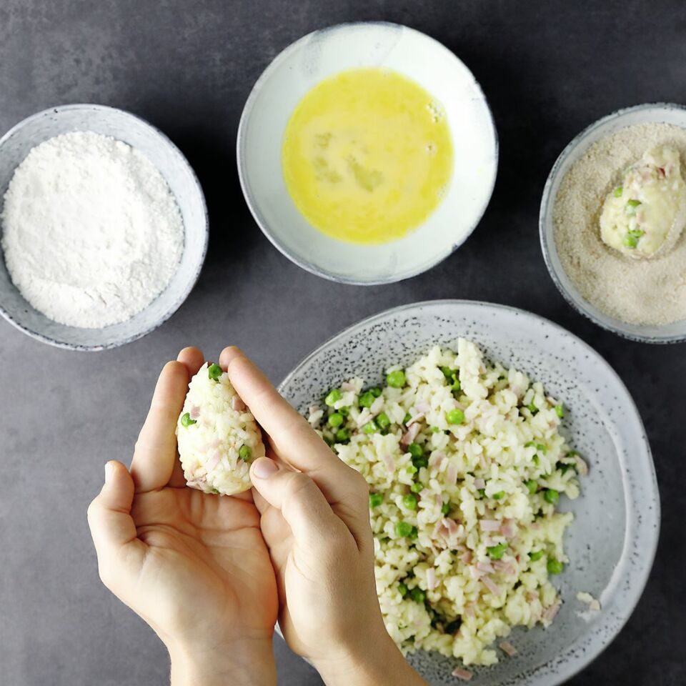 Schinken fein würfeln. Mehl und Semmelbrösel je in eine Schüssel geben. Ei in einer dritten Schüssel verquirlen. Schinken unter den Reis mengen. Mit angefeuchteten Händen je 2 EL Reis zur Kugel formen, diese dann zum Kegel. Kegel erst in Mehl wenden, dann in Ei und zuletzt in Semmelbröseln.
