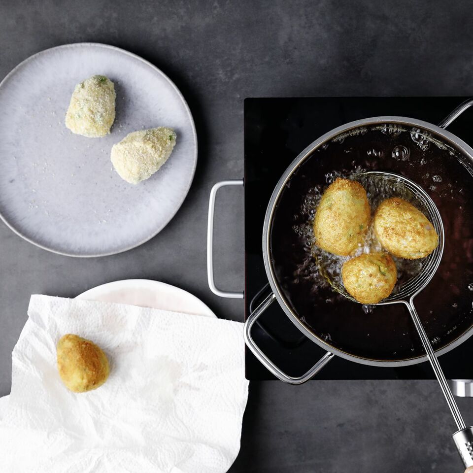 Das Öl in einer Fritteuse oder einem hohen Topf auf 170° erhitzen. Im Topf ist es heiß genug, wenn an einem hineingehaltenen Holzkochlöffelstiel sofort Bläschen aufsteigen. Höchstens drei Arancini auf einmal im Öl in 3-4 Min. goldbraun frittieren. Mit einer Schaumkelle herausheben und auf einem mit Küchenpapier belegten Kuchengitter abtropfen lassen.