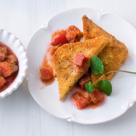 Das Butterschmalz in einer großen beschichteten Pfanne erhitzen. Die Brote darin von beiden Seiten in 2-3 Min. goldbraun braten. Mit dem Rhabarberkompott anrichten.