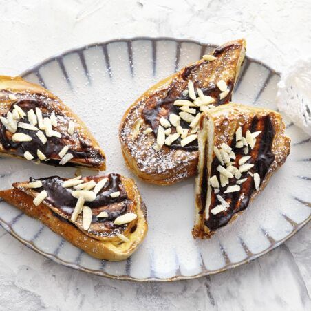 Arme Ritter auf der unteren Grillfläche verteilen. Kontaktgrill schließen. Brotscheiben 4-6 Min. bei mittlerer Hitze grillen. Arme Ritter diagonal halbieren. Mit Mandelstiften und je 1 TL Pflaumenmus verzieren. Mit übrigem Puderzucker bestäuben.