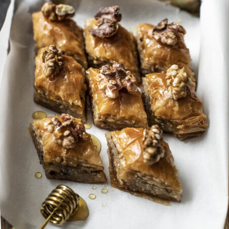 Die Pahlava mit einem scharfen Messer in Rauten schneiden und jede mit einer Wallnusshälfte verzieren. Anschließend ca. 35-40 Minuten im vorgeheizten Ofen backen. Vor dem Servieren unbedingt auskühlen lassen und mit etwas Honig beträufeln.