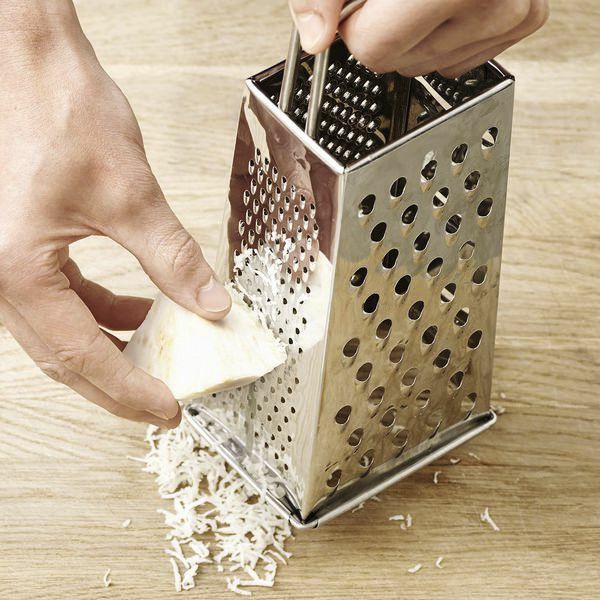 Die Möhre putzen, mit dem Sparschäler schälen und klein würfeln. Den Sellerie schälen und auf der feinen Seite der Küchenreibe raspeln.