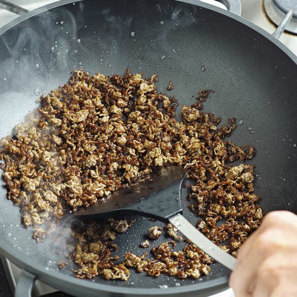 Erst den Wok, dann das Öl darin erhitzen. Das Hackfleisch darin unter Rühren bei starker Hitze in ca. 5 Min. krümelig braten. Das Hackfleisch mit Salz und Pfeffer würzen.