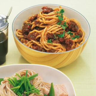 Die Nudeln nach Packungsangabe in kochend heißem Salzwasser 4 Min. ziehen lassen. In ein Sieb abgießen und abtropfen lassen.
