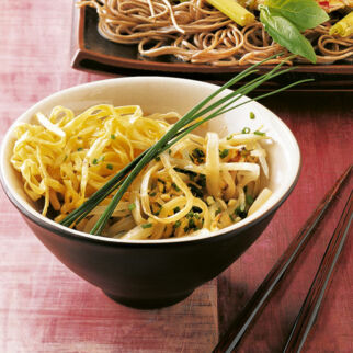 Schneller geht's nicht. Asia-Gemüse aus der Tiefkühltruhe wird mit Sojasauce und Sesamöl gewürzt. Dazu Eiernudeln, die in nur 4 Minuten fertig sind.