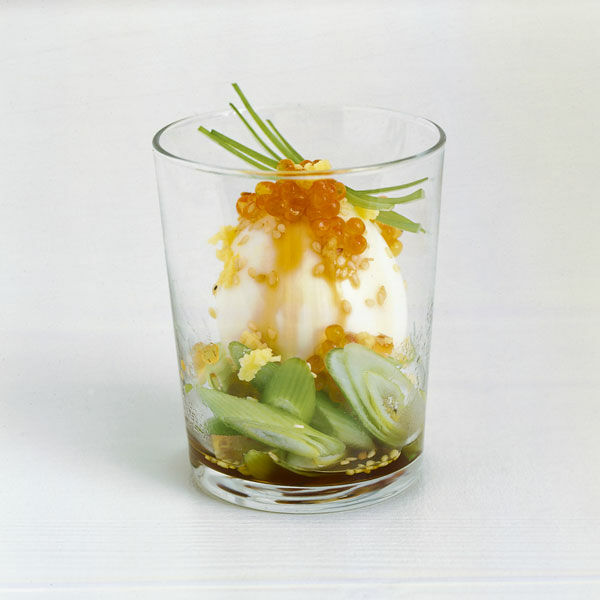 > Die gegarten Eier abgießen und nur ganz kurz abschrecken. Jetzt vorsichtig pellen – am besten hilft dabei jemand, damit sie heiß bleiben. Je 1 Ei in ein Glas geben, Sojahonig darüber gießen, mit Kaviar krönen und mit Sesam bestreuen. Zum Schluss das zweite Stück Ingwer fein darüber reiben. Asia-Eier gleich mit dem Eierlöffel essen! Ein Tipp am Ende: Statt Sojahonig 6 EL Kejap manis nehmen, die süße indonesische Sojasauce aus dem guten Asia-Laden.