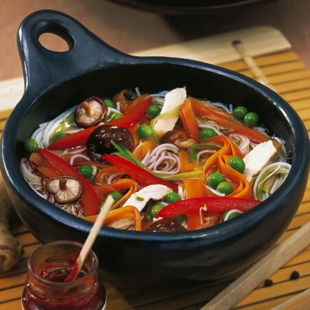 Das vorbereitete Gemüse und die Erbsen in die Brühe geben und zugedeckt bei milder Hitze 10-15 Min. ziehen lassen, bis die Möhren bissfest sind. Das Fleisch in feine Streifen schneiden und mit den Pilzen und den Nudeln unterheben. Mit Sojasauce würzen und mit Salz und Pfeffer abschmecken. Nach Belieben Sambal oelek getrennt dazureichen.