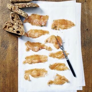Die Beize von den Filets entfernen und den Fisch trocken tupfen. Filets mit einem sehr scharfen, langen Messer schräg zur Faser in hauchdünne Scheiben schneiden.