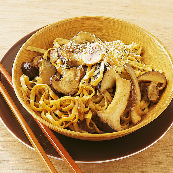 Neutrales Öl im Wok erhitzen. Pilze darin unter Rühren 3-4 Min. braten. Ingwer und Knoblauch untermischen, Pilze mit Sojasauce, Sesamöl und Salz abschmecken. Nudeln untermischen und erwärmen. Mit Sesam bestreut servieren.