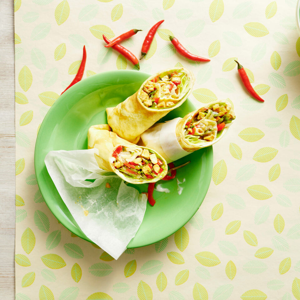 Die Mayonnaise mit dem Joghurt und Limettensaft verrühren, mit Salz und Pfeffer würzen. Salatblätter waschen und trockentupfen. Zum Belegen je 1 Pfannkuchen mit 1 EL Joghurt-Creme bestreichen, dabei rundherum einen ca. 2 cm breiten Rand lassen. Je 1 Salatblatt darauflegen und ca. ¼ vom Tempeh-Mix darauf verteilen. Pfannkuchen aufrollen und in Folie wickeln. 30 Min. kalt stellen, dann schräg halbieren.