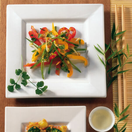 Lecker und gesund: Diese exotische Kombination aus Paprika, Zuckerschoten, Sojabohnensprossen und Frühlingszwiebeln eignet sich perfekt als Vorspeise oder Beilage.