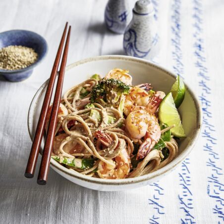 Frische-Kick: Das Asia-Gericht mit Garten- oder Brunnenkresse und mit Limettenspalten servieren. Wer es lieber vegetarisch mag, lässt einfach die Garnelen weg.
