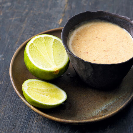 Ingwer, Datteln und den Limettensaft mit den restlichen Zutaten in einen hohen Rührbecher geben. Alles mit dem Pürierstab fein aufschlagen, dabei nach Wunsch esslöffelweise mit eiskaltem Wasser verdünnen.