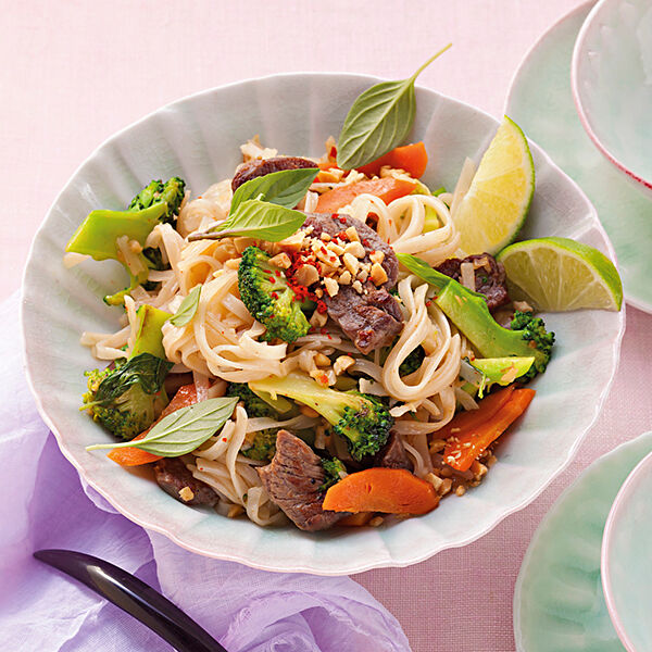 Das Fleisch und die Nudeln zum Gemüse geben. Die Würzflüssigkeit darübergießen. Das Ganze unter Rühren noch 4-5 Min. braten, bis alles heiß ist. Basilikum und die gehackten Erdnüsse unterheben. Die Bratnudeln mit Salz abschmecken.