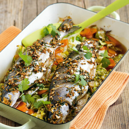 Den Backofen auf 200° (Umluft 180°) vorheizen. Die Möhren schälen und schräg in Scheiben schneiden. Den Kohl waschen und putzen, die Blätter in Rauten schneiden. Das Gemüse auf einem Backblech verteilen und die Fische darauflegen. Marinade mit 250 ml Wasser verrühren, darüberträufeln. Im Ofen (Mitte) 25-30 Min. backen. Mit restlichem Koriander bestreuen.