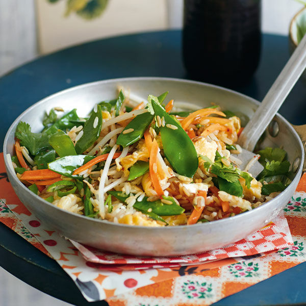 Gekochter Reis (ideal wenn vom Vortag was übrig geblieben ist) ist die Basis. An Gemüse können Sie alles verwenden, was Sie im Kühlschrank vorfinden.