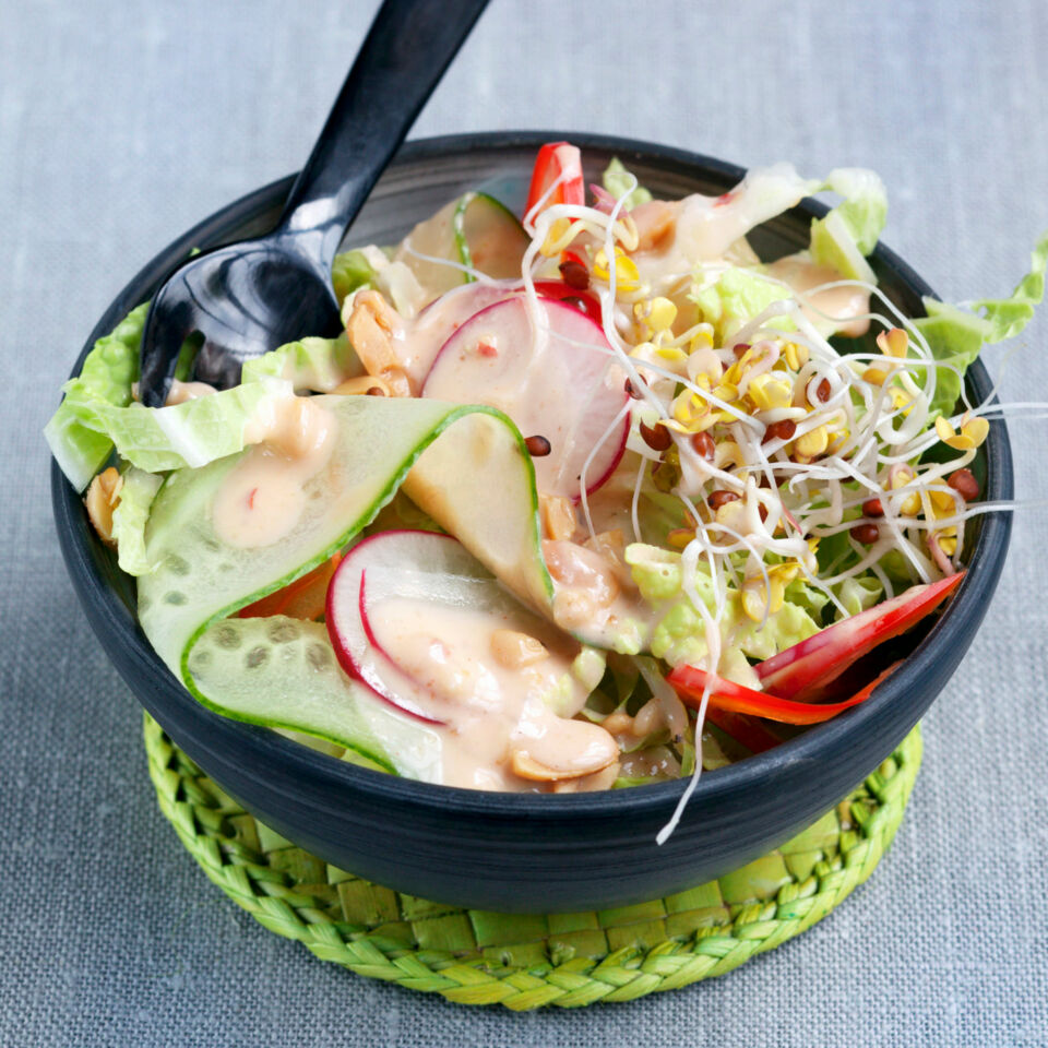 Limettensaft, Kokosmilch, Erdnussbutter, Sambal oelek, Salz und Zucker mit dem Öl verrühren. Gemüse im Dressing wenden.