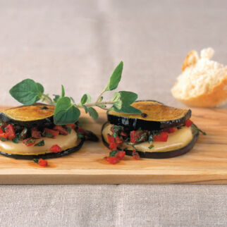 Auch ganze dünne Baguettescheiben kann man im Raclettegerät überbacken. Hier werden dillwürzige Knusperhappen aus Auberginen zubereitet.