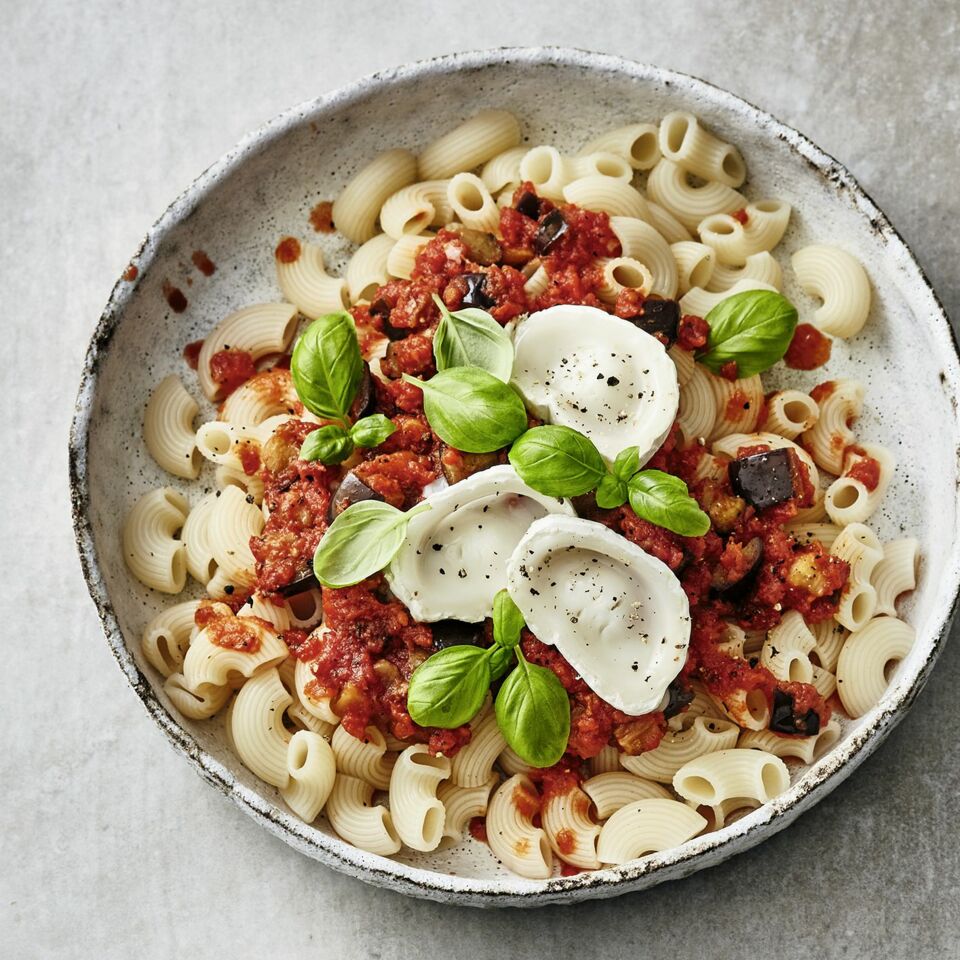 Ein leckeres mediterranes Pastagericht mit einer Sauce auch Auberginen und Tomaten und würzigem Ziegenkäse.