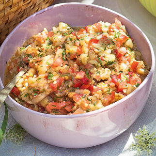 Backofen auf 250° (Umluft 220°) vorheizen. Aubergine waschen und auf dem Backblech im Ofen (Mitte) in etwa 30 Min. weich garen. Zwiebeln waschen, putzen und sehr fein hacken. Tomate waschen und ganz klein würfeln, dabei Stielansatz entfernen. Petersilie waschen, trockenschütteln und die Blättchen fein hacken.
