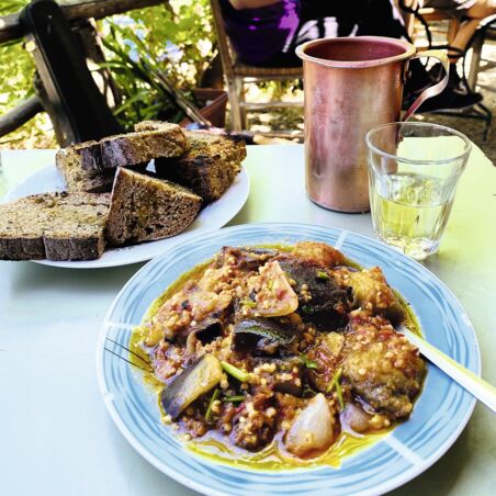 Griechischer Joghurt rundet den Geschmack des Eintopfs perfekt ab. Entweder träufelt man ihn direkt darüber oder man serviert ihn dazu.